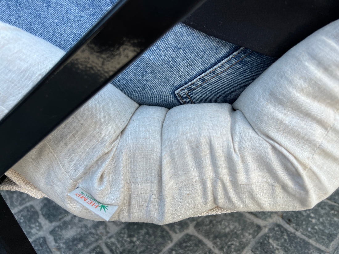 We present to you our novelty - Lounge Sling Steel Chair, handmade by our employee and metal craftsman. We have combined our favorite organic materials - Pure Hemp, Linen and pure high-quality iron. With soft hemp cushion filled hemp organic fiber in hemp fabric.