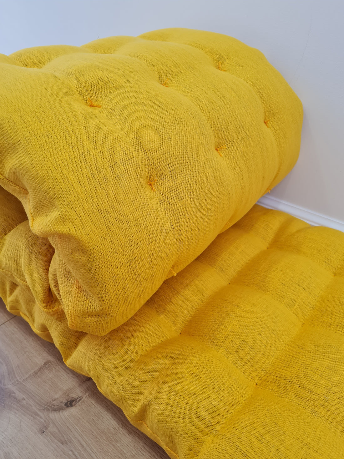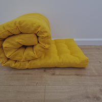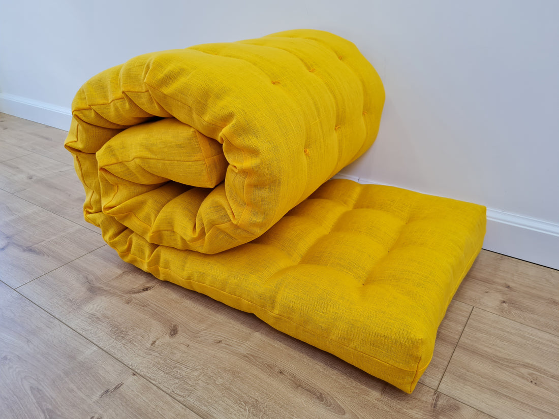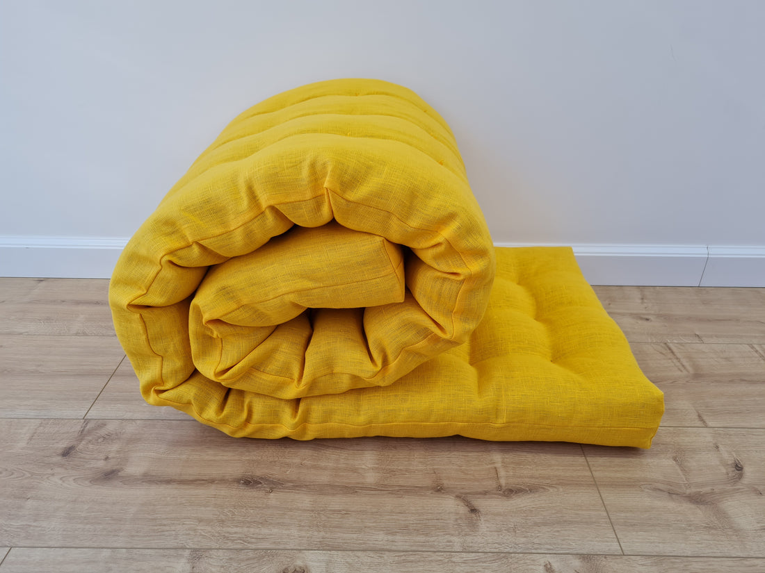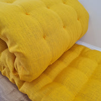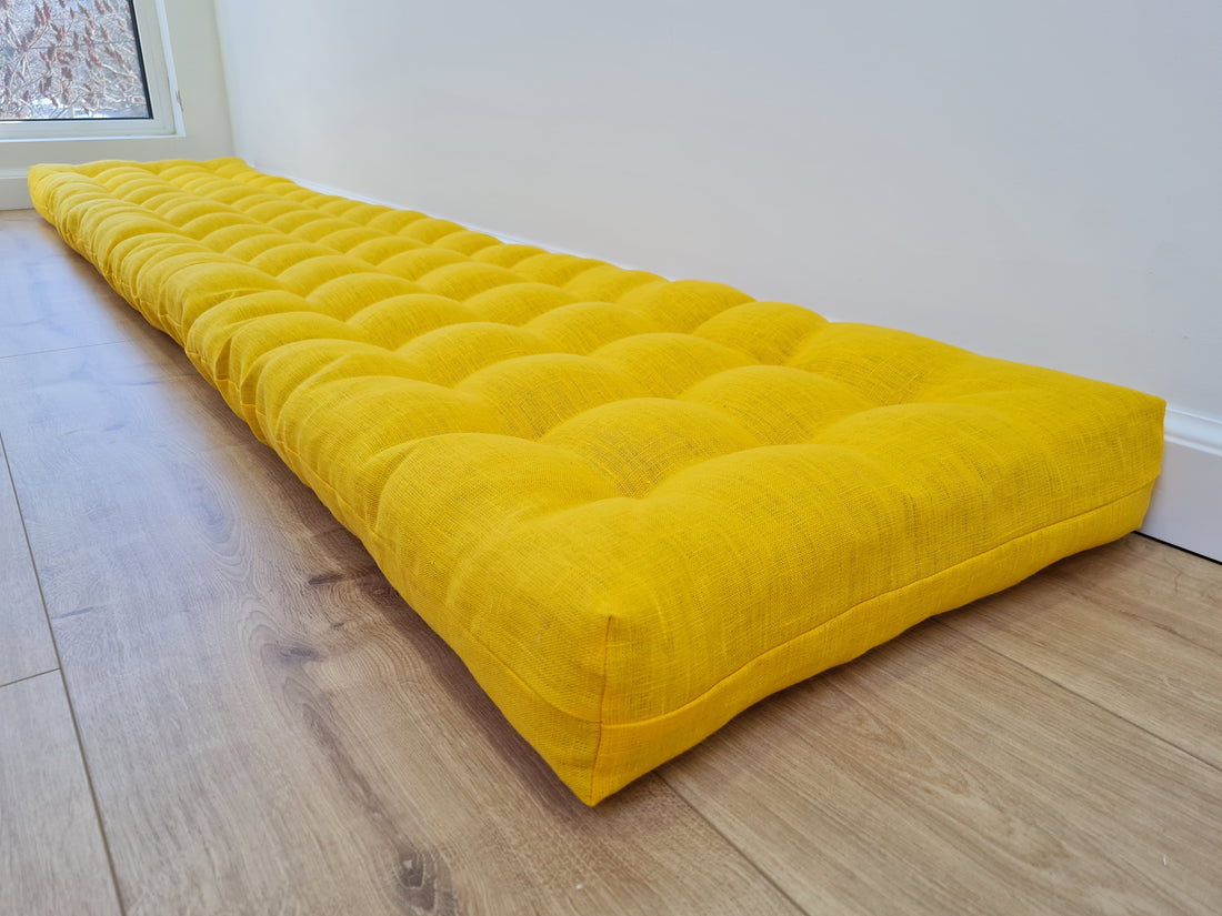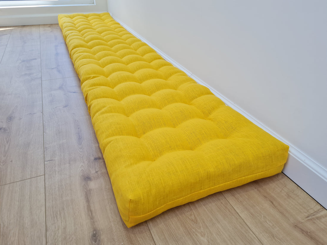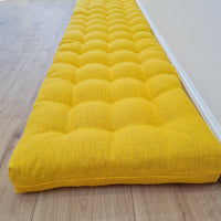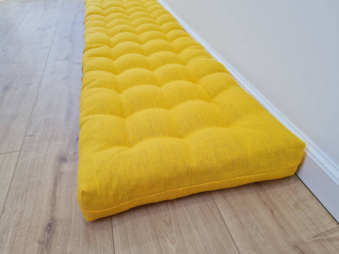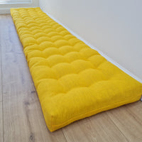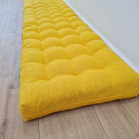 Hemp Linen cushion mat with organic hemp fiber filling in natural bright yellow linen fabric window bench cushion custom made