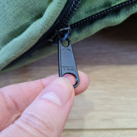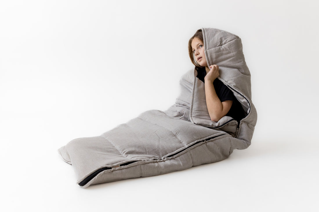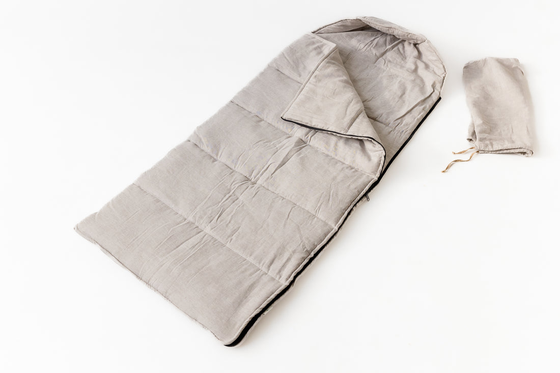 Natural sleeping bag with hood filled organic HEMP FIBER in Linen Linen fabric.